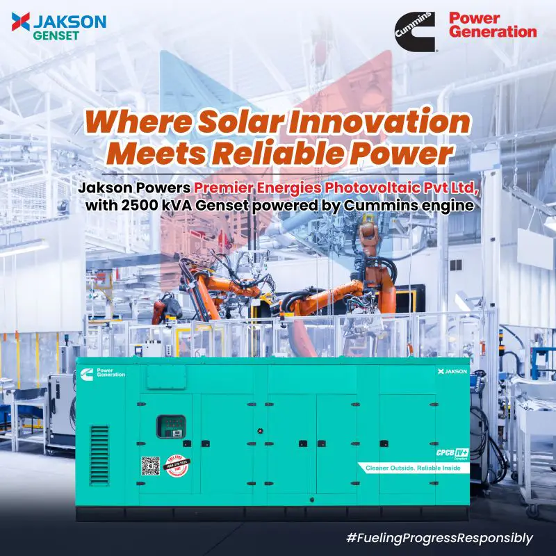 Jakson’s 2500 kVA Genset powered by Cummins engine now energizes Premier Energies Photovoltaic Pvt. Ltd., ensuring seamless operations and optimal efficiency.