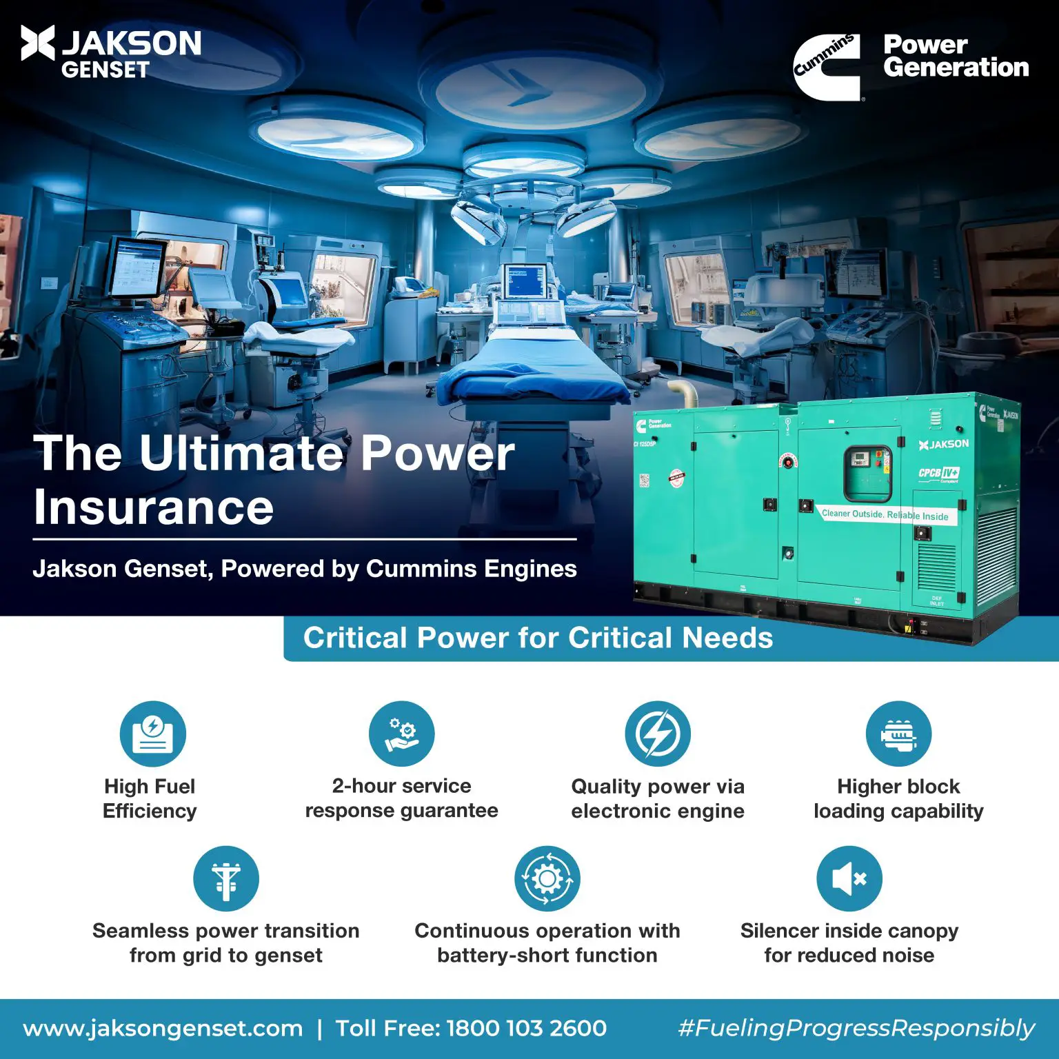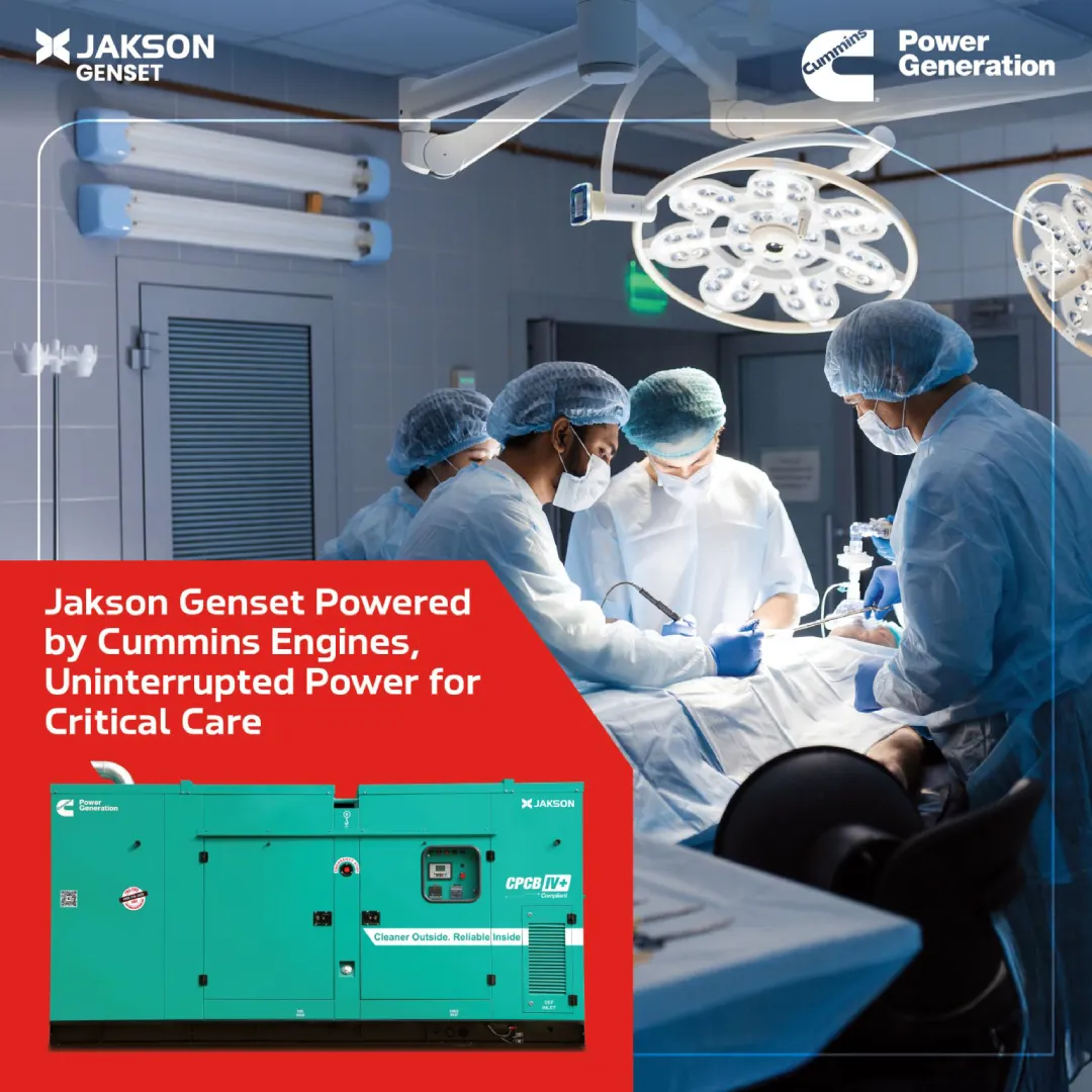 Jakson Gensets powered by Cummins engines ensure uninterrupted electricity for hospitals and medical facilities, safeguarding lives with dependable performance and instant backup.